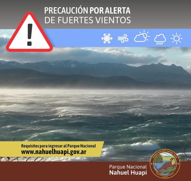 La Intendencia del Parque Nacional Nahuel Huapi informó que, de acuerdo con el reporte emitido por el Servicio Meteorológico Nacional (SMN), rige un alerta amarillo por vientos fuertes para este lunes 2 de febrero, afectando gran parte del área protegida y la zona de influencia de Villa La Angostura.