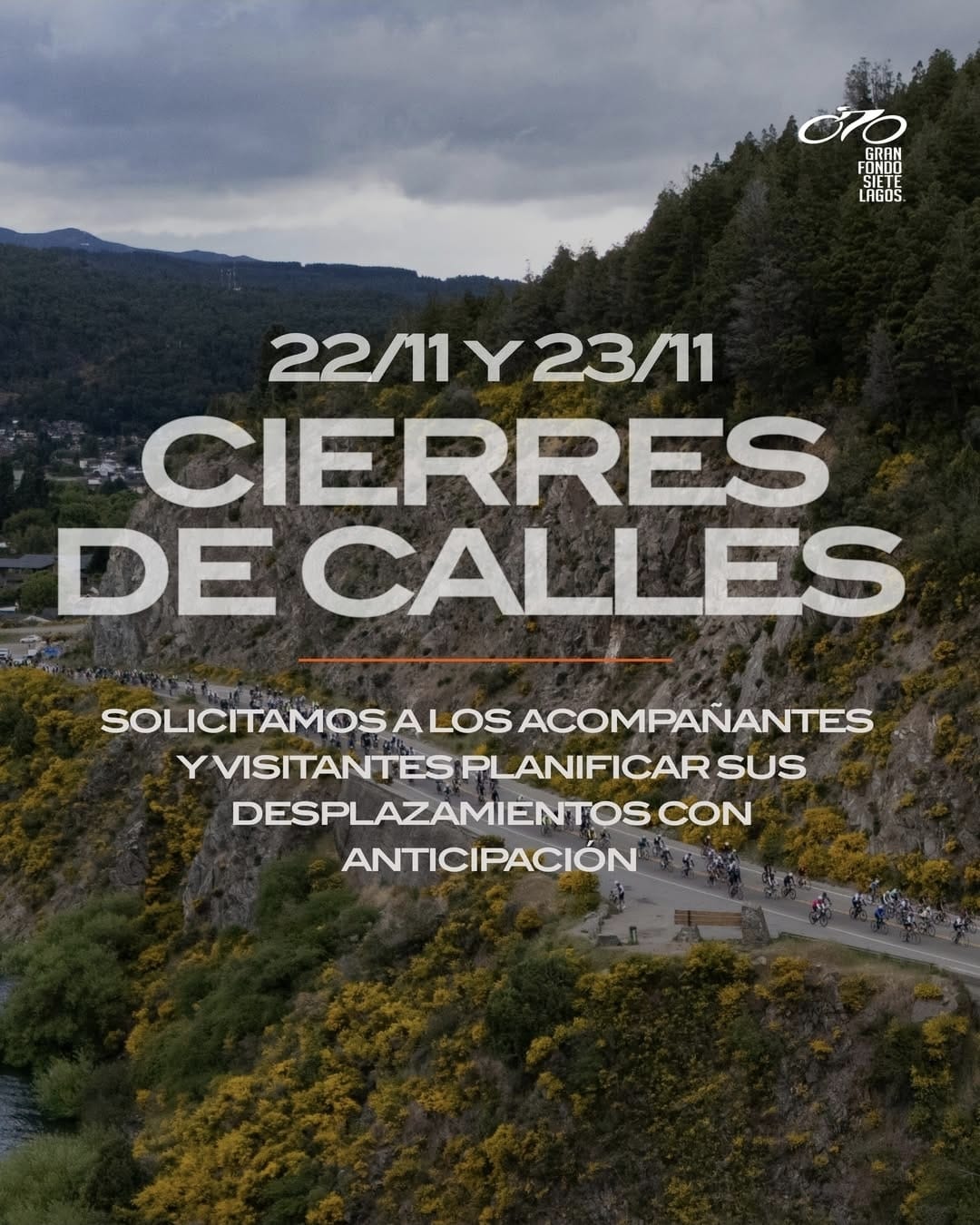 Con motivo de la realización del Gran Fondo 7 Lagos, se informa a la comunidad que se dispondrán cortes totales en la Ruta 40 – Siete Lagos, con la debida autorización de Vialidad Nacional, Vialidad Provincial y la Agencia Nacional de Seguridad Vial.