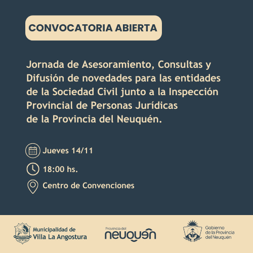 La Subsecretaría de Relaciones Institucionales, dependiente de la Secretaría de Gobierno de la Municipalidad de Villa La Angostura, invita a las Asociaciones Civiles, Organizaciones Sociales, Juntas Vecinales, Asociaciones Cooperadoras y Clubes de la localidad, al encuentro de asesoramiento y consultas sobre regulación jurídica contable. La coordinación y asesoramiento estará a cargo del Contador Esteban Junca, titular del Órgano de Inspección de Persona Jurídicas, dependiente de la Subsecretaría de Gobierno de la provincia.