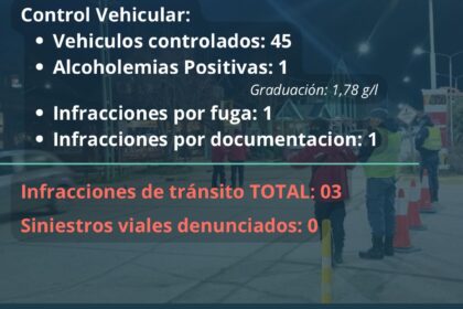 Durante la jornada del domingo se fiscalizaron 45 vehículos en distintos puntos de la localidad. En total, se labraron tres infracciones de tránsito. La Secretaría de Seguridad y Ordenamiento Vial de ...