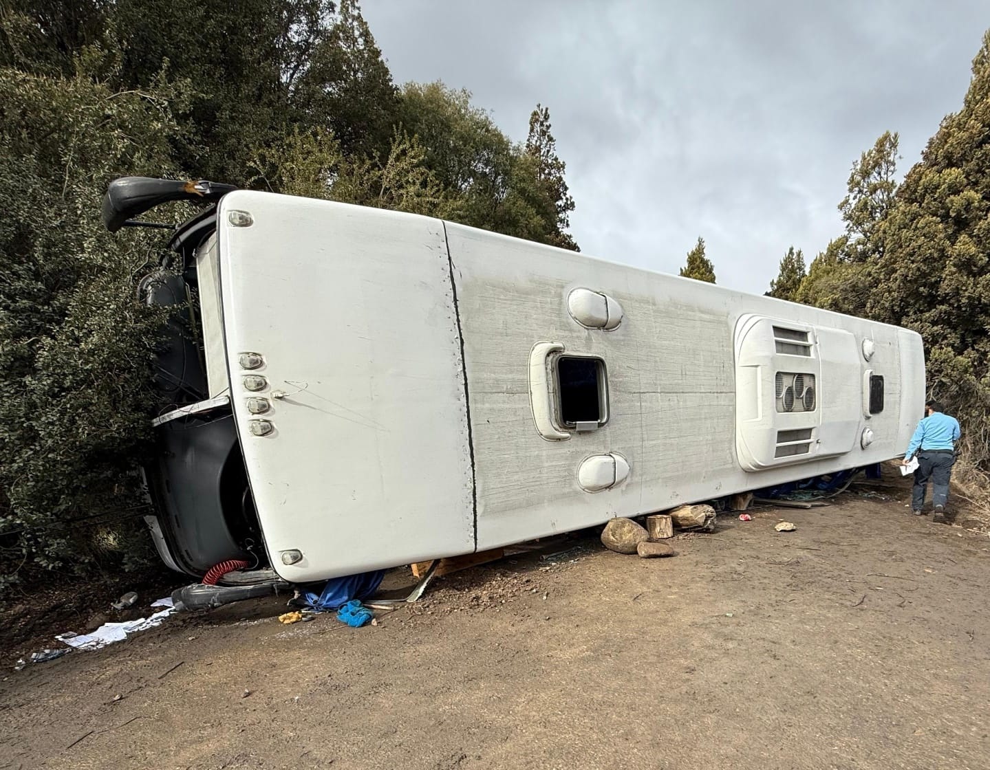 Un colectivo que transportaba a 44 pasajeros volcó este martes en la Ruta Provincial 65, a la altura del sector conocido como Río Minero, a unos 15 kilómetros de Villa Traful. El accidente dejó un sal...