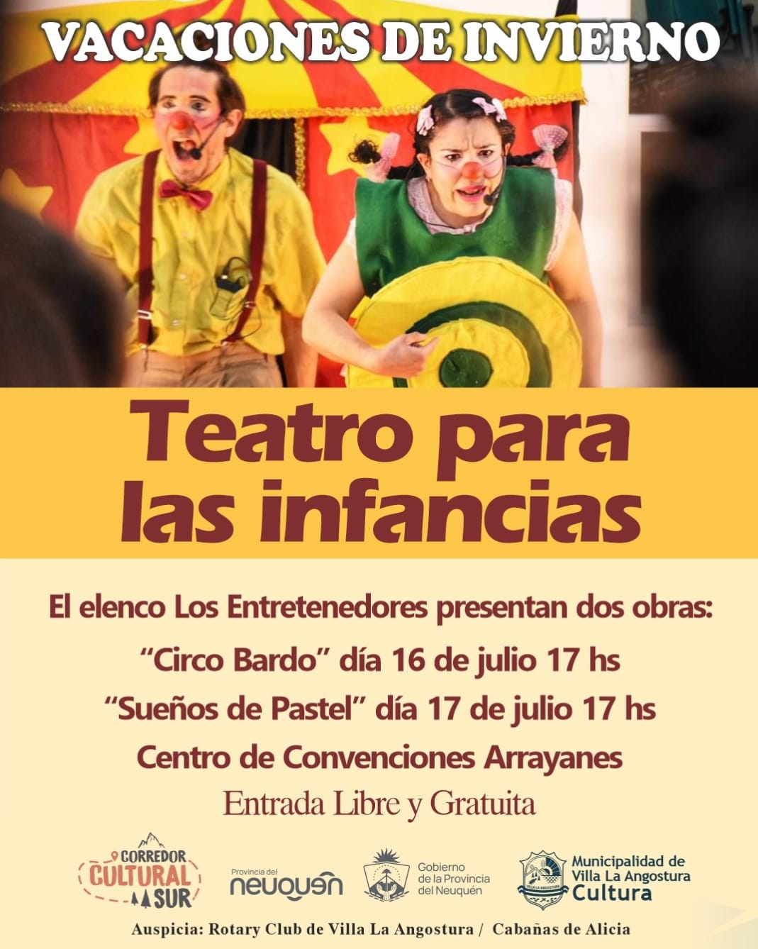 En el marco de las vacaciones de invierno, la Municipalidad de Villa La Angostura, a través de la Secretaría de Cultura, invita a niños, niñas y familias a disfrutar de dos jornadas de teatro con entr...