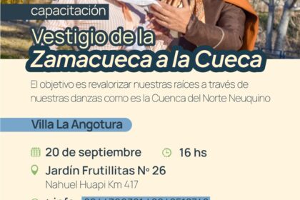 El encuentro “Vestigio de la Zamacueca a la Cueca” se realizará el viernes 20 de septiembre en el Jardín Frutillitas Nº 26. La Municipalidad de Villa La Angostura invitó a la comunidad a participar de...