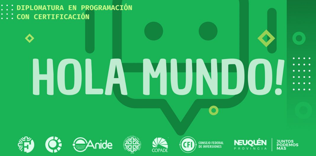 Comenzará una nueva edición de la Diplomatura en Programación “Hola Mundo”. Se trata de una capacitación organizada por la Facultad de Informática de la Universidad Nacional del Comahue en conjunto con el gobierno de la provincia del Neuquén, a través de la Agencia Neuquina de Innovación para el Desarrollo y la Secretaría de Planificación y Acción para el Desarrollo (COPADE). Cuenta con el apoyo técnico y financiero del Consejo Federal de Inversiones (CFI).