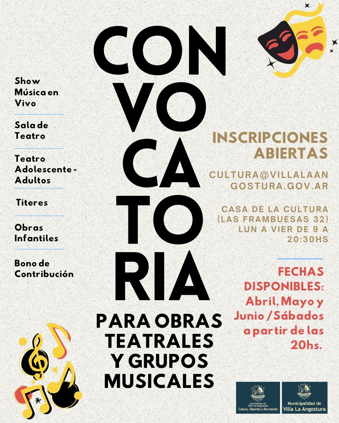 La Casa de la Cultura de Villa La Angostura abre su convocatoria a todos los artistas que cuenten con un espectáculo armado, ya sea teatral o musical, para presentarse durante todos los Sábados del mes de Abril, Mayo y Junio. Esta iniciativa busca enriquecer la oferta cultural de la comunidad y brindar un espacio para el talento local.