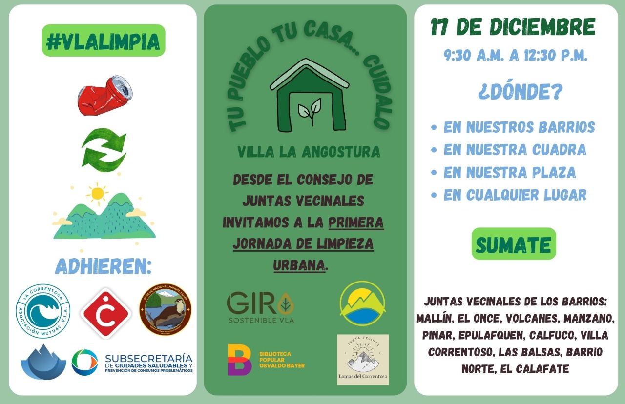 Desde el Consejo de Juntas Vecinales, con el acompañamiento de la Municipalidad de Villa La Angostura, la Subsecretaría de Ciudades Saludables, Giro Sostenible, Asociación de Hoteles y Restaurantes, Cámara de comercio, Asociación Mutual La Correntosa, Parques Nacional Nahuel Huapi y la Biblioteca Popular Osvaldo Bayer, invitan a la comunidad a participar de la Primera Jornada de Limpieza Urbana.