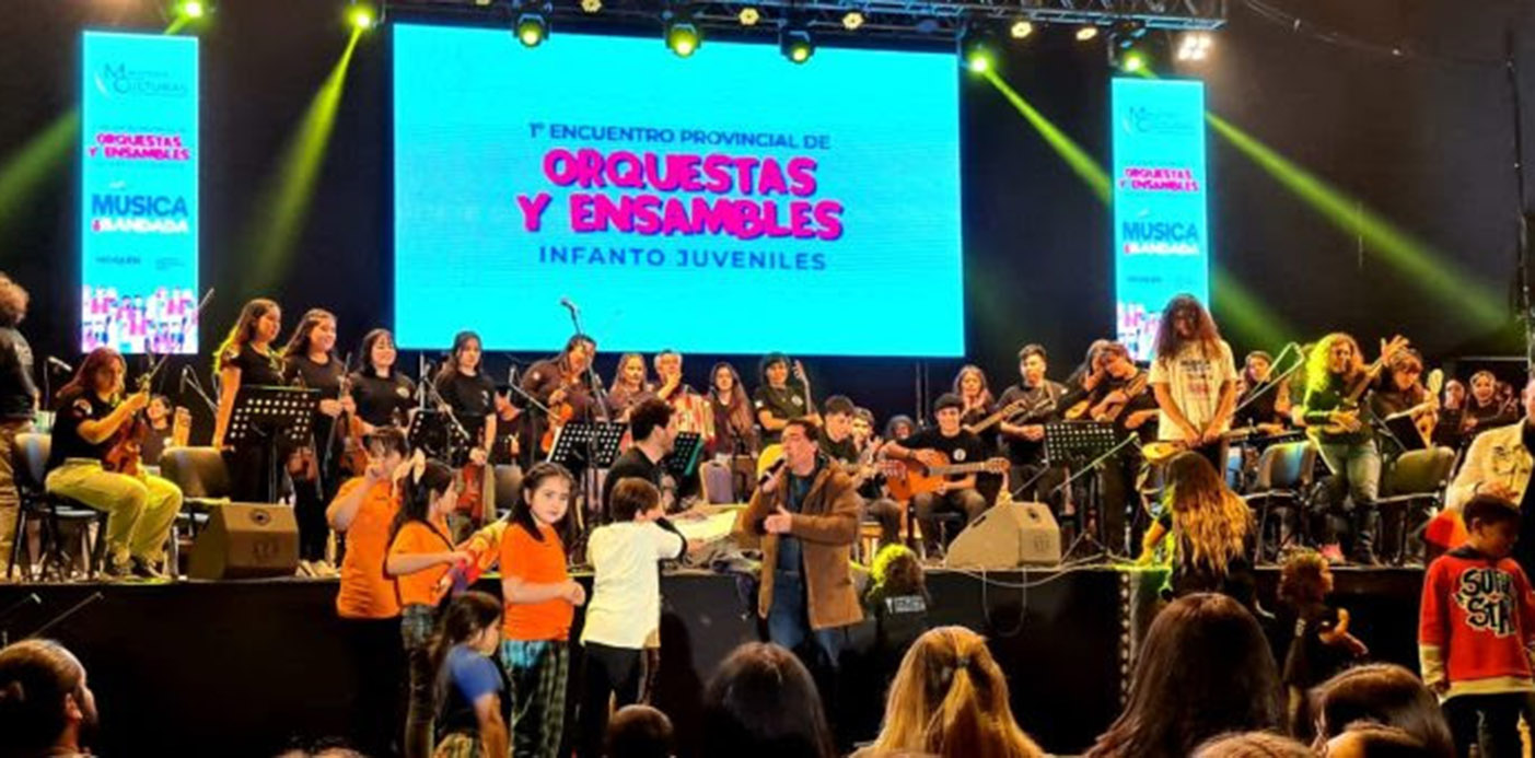 Durante 2022 se entregaron 750 instrumentos musicales en toda la provincia y se realizó el 1º Encuentro Provincial de Orquestas Infanto Juveniles, que reunió más de 900 niños y niñas en el Estadio Ruca Che de Neuquén para mostrar, durante dos jornadas, el trabajo de 22 orquestas de toda la provincia.