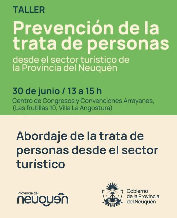 El Ministerio de Turismo de la Provincia del Neuquén invita a profesionales y personal del sector turístico a participar en el taller regional titulado “Prevención de la Trata de Personas desde el Sector Turístico de la Provincia del Neuquén, que se realizará el próximo 30 de junio, de 13 a 15 horas, en el Centro de Congresos y Convenciones Arrayanes, ubicado en Las Frutillas 10, Villa La Angostura.