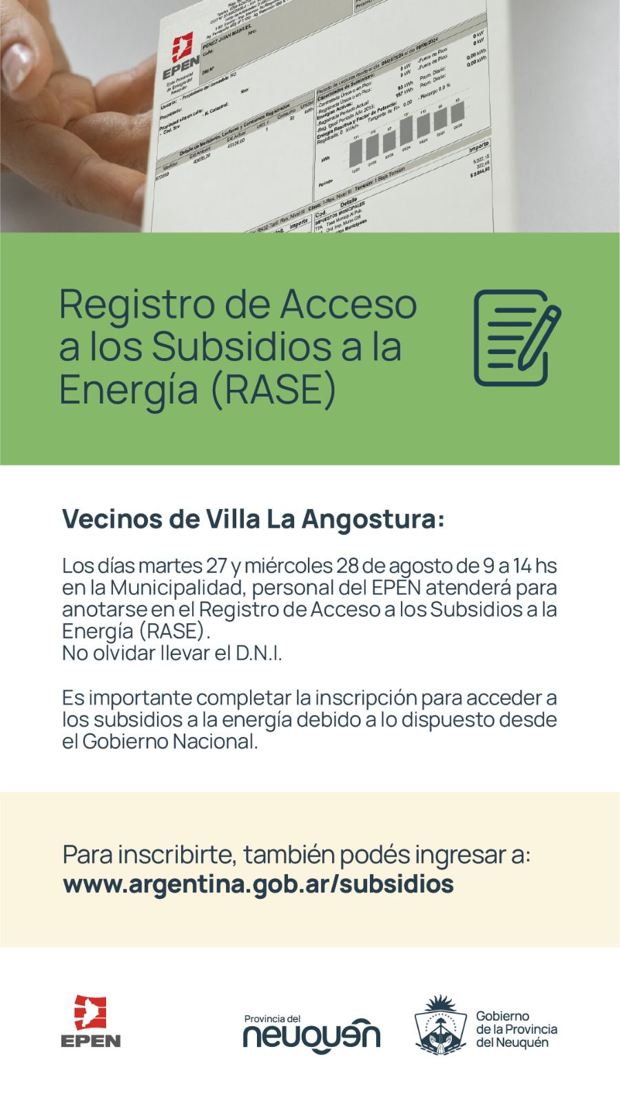 El Ente Provincial de Energía del Neuquén (EPEN), bajo la órbita del Ministerio de Infraestructura, ha decidido reforzar la atención en sus oficinas comerciales de la región sur de la provincia, con el fin de facilitar la inscripción al Registro de Acceso a los Subsidios a la Energía (RASE) para aquellos usuarios de bajos ingresos que aún no han completado el trámite.