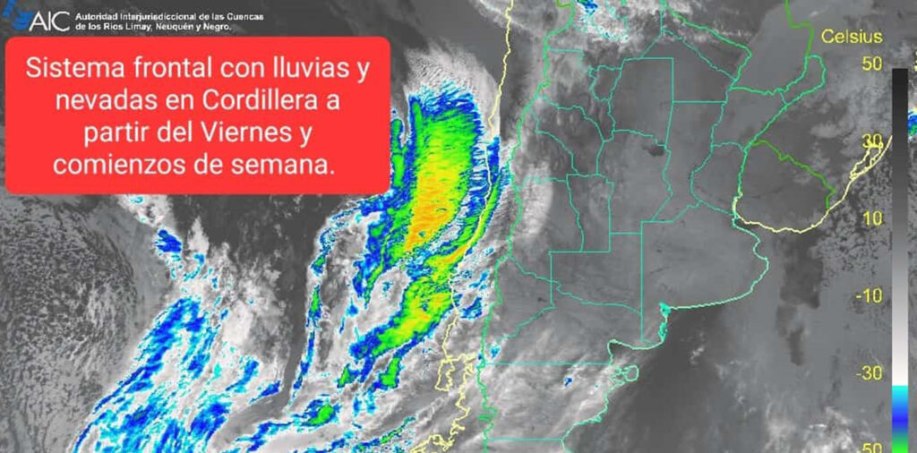 La Autoridad Interjurisdiccional de Cuencas (AIC) informó esta mañana sobre el ingreso de un sistema frontal desde el Océano Pacífico sobre la zona cordillerana de las provincias de Río Negro, Chubut y Neuquén, que comienza desde hoy jueves 19. Este fenómeno provocará lluvias y nevadas en localidades cordilleranas de la provincia del Neuquén.