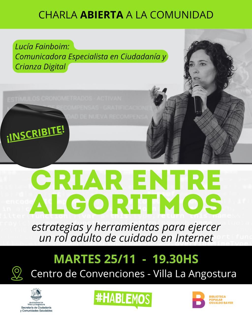 El próximo martes 25 de noviembre, a las 19:30 horas, se brindará la charla abierta a toda la comunidad “Criar entre Algoritmos” en el Centro de Convenciones.