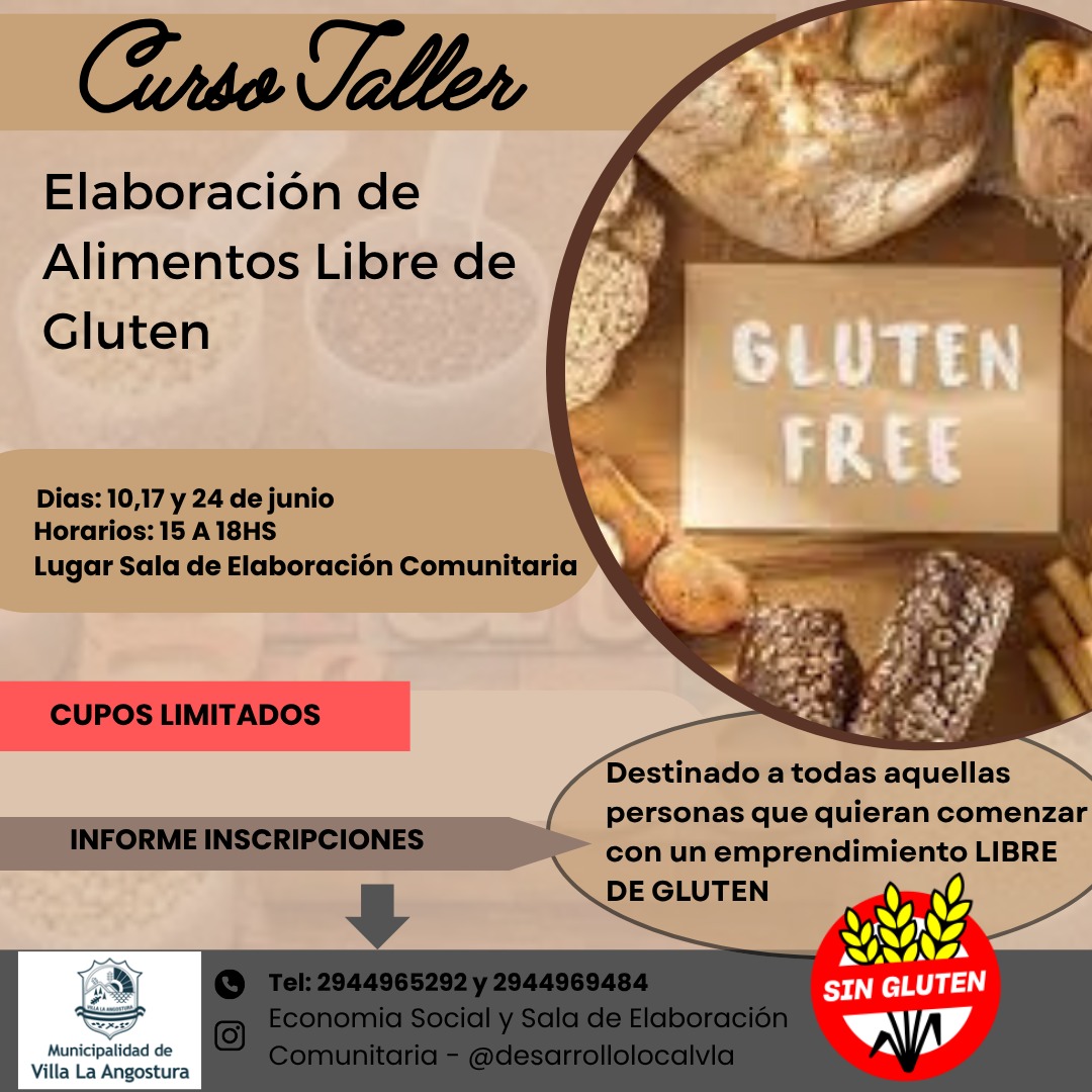 La Dirección de Desarrollo Local de la Municipalidad de Villa La Angostura invita a la comunidad a participar del taller de elaboración de alimentos libres de gluten, diseñados para quienes buscan comenzar un emprendimiento en esta especialidad. La actividad está dirigida a todas aquellas personas interesadas en aprender técnicas y recetas para preparar alimentos sin gluten, promoviendo una alimentación inclusiva y saludable.