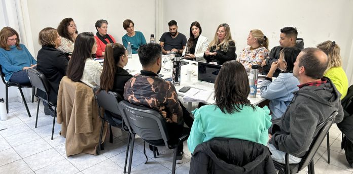 La funcionaria se reunió con el equipo a cargo de la capacitación y con las subsecretarias de las Mujeres, Lorena Barabini, y de Diversidad, Luz Blanco, para avanzar en el desarrollo de estrategias para el trabajo en territorio, coordinar acciones y dinámicas de trabajo, conformar nuevos equipos de formadores y mapear el proceso e instancias de capacitación en base a la regionalización impulsada desde el Gobierno Provincial.