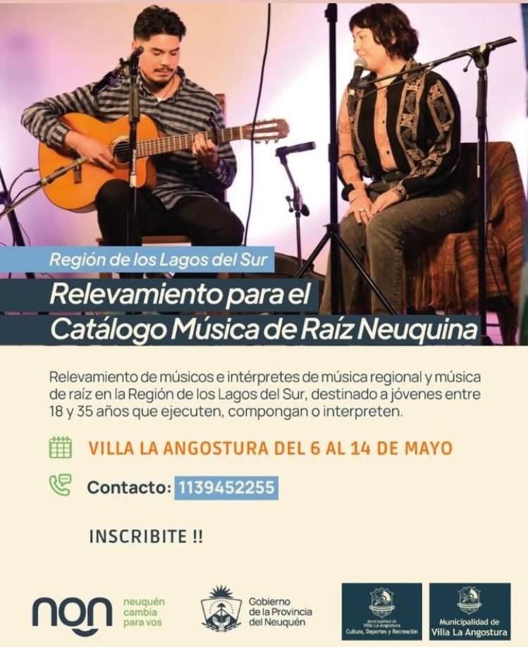 Del 6 al 14 de mayo, llega a Villa La Angostura, el proyecto MÚSICA DE RAÍZ NEUQUINA, que busca registrar en audio la música tradicional campesina de la provincia interpretada por jóvenes entre 18 y 35 años para crear un catálogo digital de Música de Raíz Neuquina con artistas que interpreten música campesina.