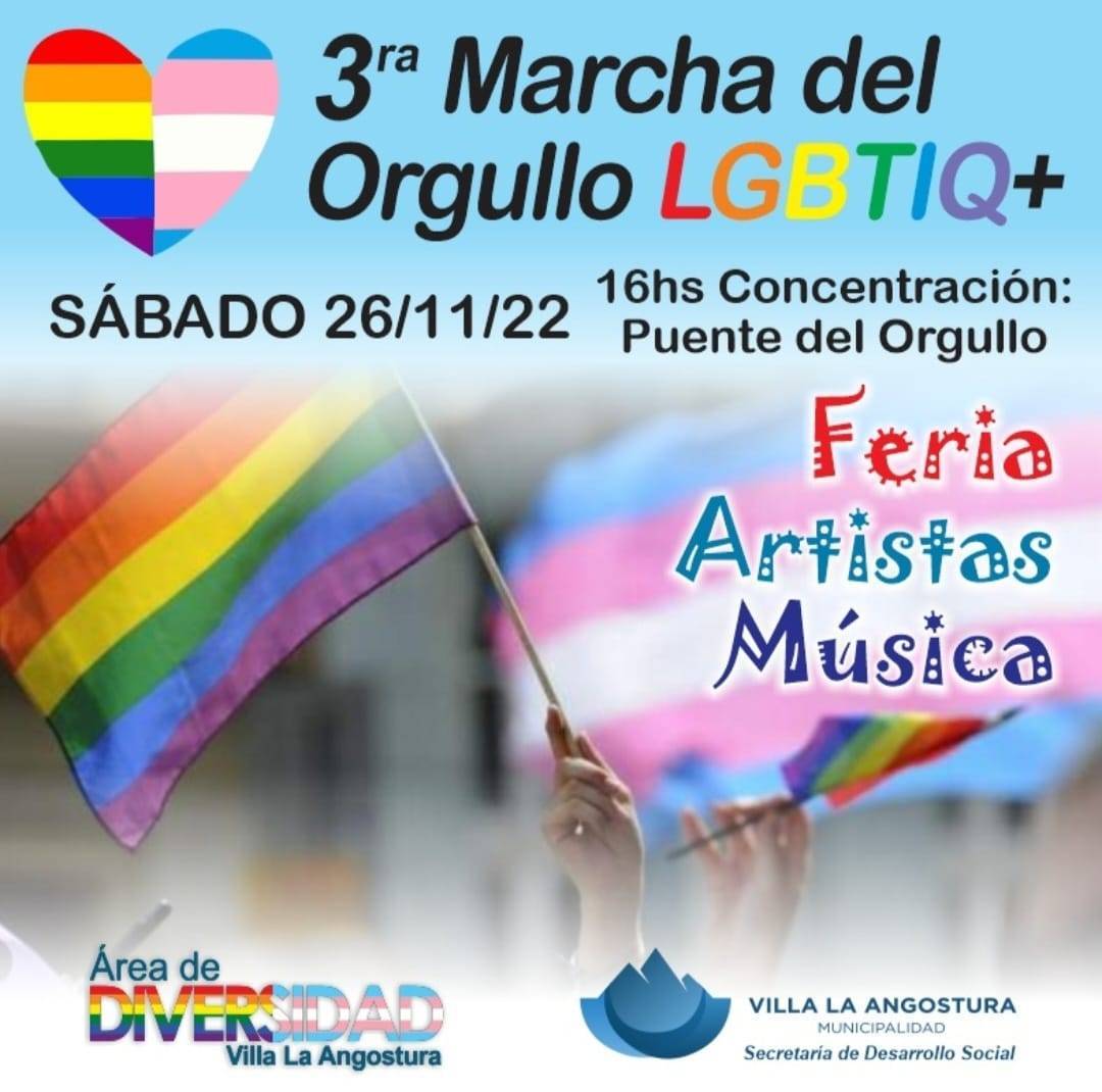 El próximo sábado 26 de noviembre a las a partir de las 16 horas se realizará la 3° Marcha del Orgullo en la Plaza de La Diversidad de Villa La Angostura, concentrándose en el Puente de los colores, en el ingreso a la localidad.