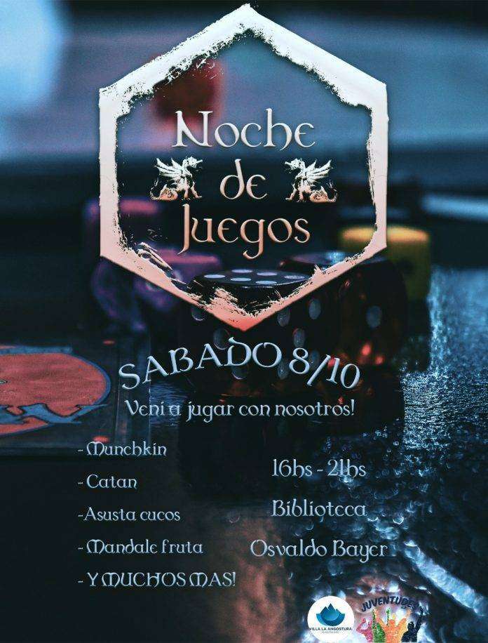 El Área de Juventud, dependiente de la Secretaría de Desarrollo Social, invita a participar de una nueva edición de la Noche de Juegos, el próximo sábado 8 de octubre de 16 a 21 horas en la Biblioteca Osvaldo Bayer.
