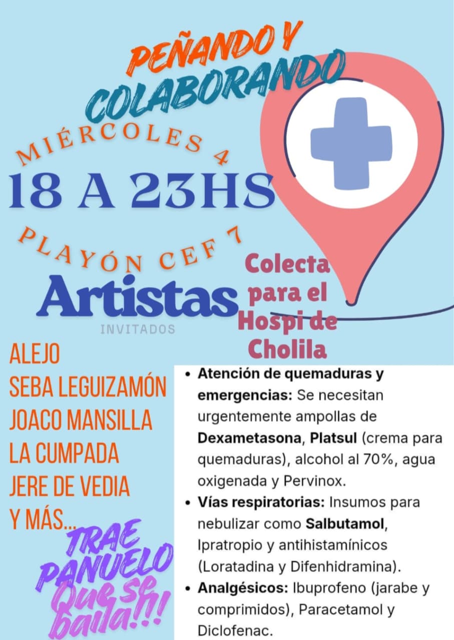 El evento se llevará a cabo en el playón del CEF N.º 7, en el horario de 18:00 a 23:00 horas. El objetivo no es recaudar dinero en efectivo, sino acopiar insumos médicos de primera necesidad que el Hospital de Cholila está requiriendo con urgencia para atender a brigadistas y vecinos afectados por el fuego y el humo.
