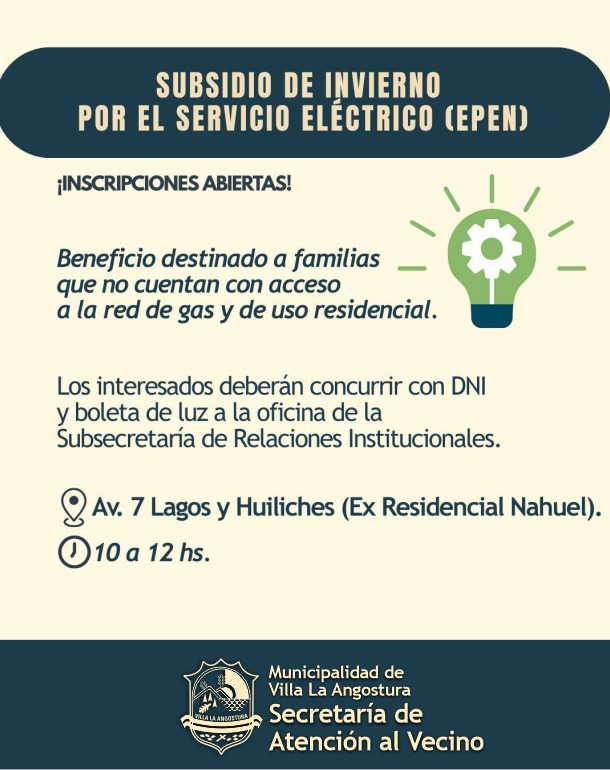 La Secretaría de Atención al Vecino informa que se encuentra abierta la inscripción para el Subsidio de Invierno para el Servicio Eléctrico (EPEN).