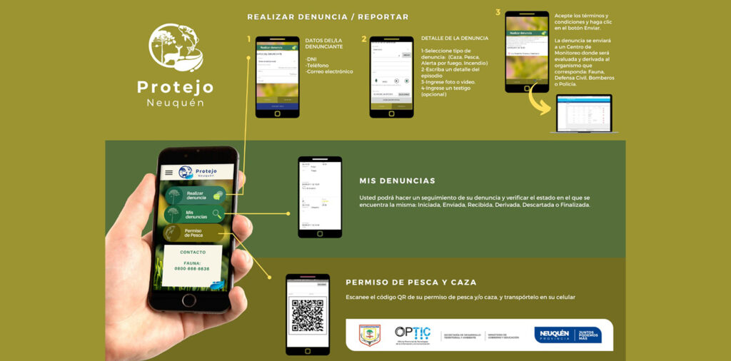 Paniccia agregó que “Protejo Neuquén se podrá descargar desde la página web neuquen.gov.ar o desde Play Store a móviles celulares y permitirá a turistas transportar de manera digital su permiso de pesca y en paralelo realizar alertas y/o denuncias sobre situaciones que identifique como peligrosas para la fauna y ambiente en todo el territorio provincial”.