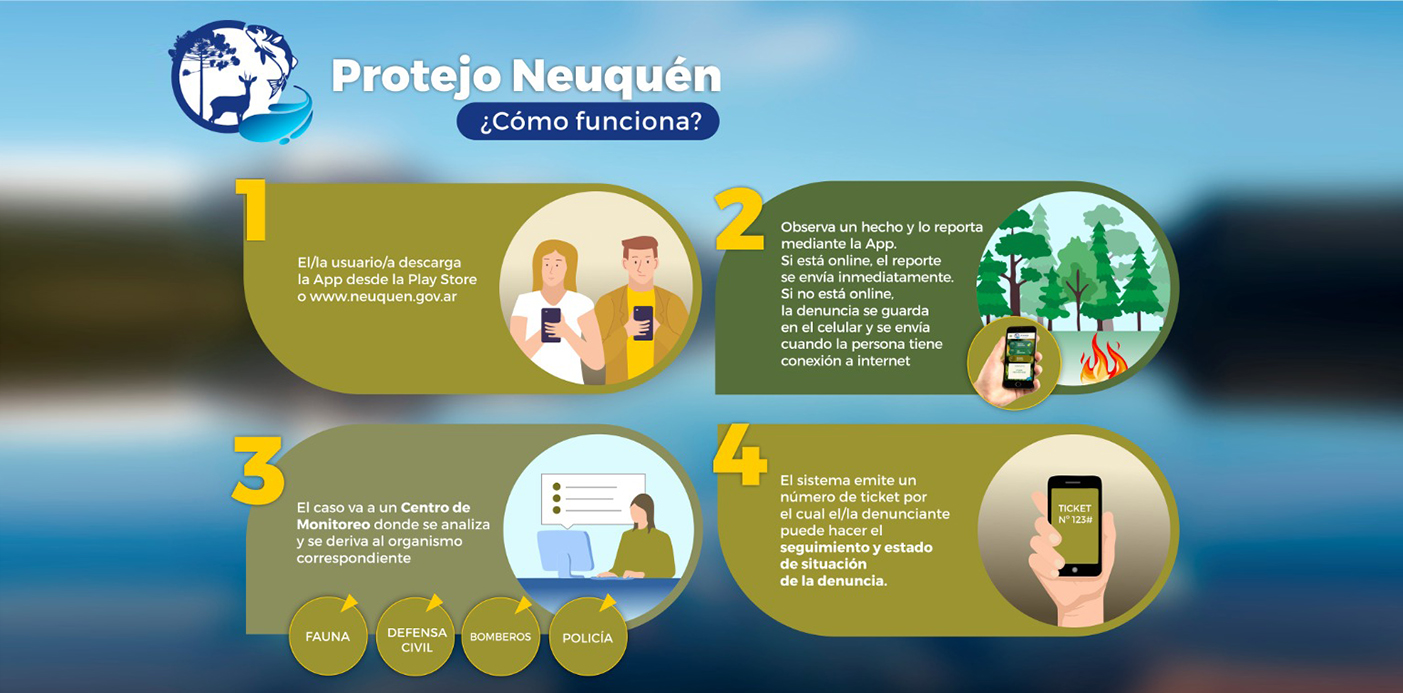 Paniccia agregó que “Protejo Neuquén se podrá descargar desde la página web neuquen.gov.ar o desde Play Store a móviles celulares y permitirá a turistas transportar de manera digital su permiso de pesca y en paralelo realizar alertas y/o denuncias sobre situaciones que identifique como peligrosas para la fauna y ambiente en todo el territorio provincial”.