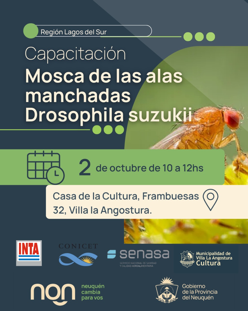 La Municipalidad de Villa La Angostura, a través de la Secretaría de Cultura, en conjunto con INTA, CONICET, SENASA y el Gobierno de la Provincia del Neuquén, invita a la comunidad a participar de una capacitación sobre la plaga “Mosca de las alas manchadas – Drosophila suzukii”.