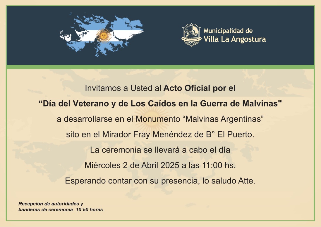 Villa La Angostura se prepara para rendir homenaje a los Veteranos y Caídos en la Guerra de Malvinas con una serie de actos conmemorativos que se llevarán a cabo el 1 y 2 de abril en distintos puntos de la localidad.