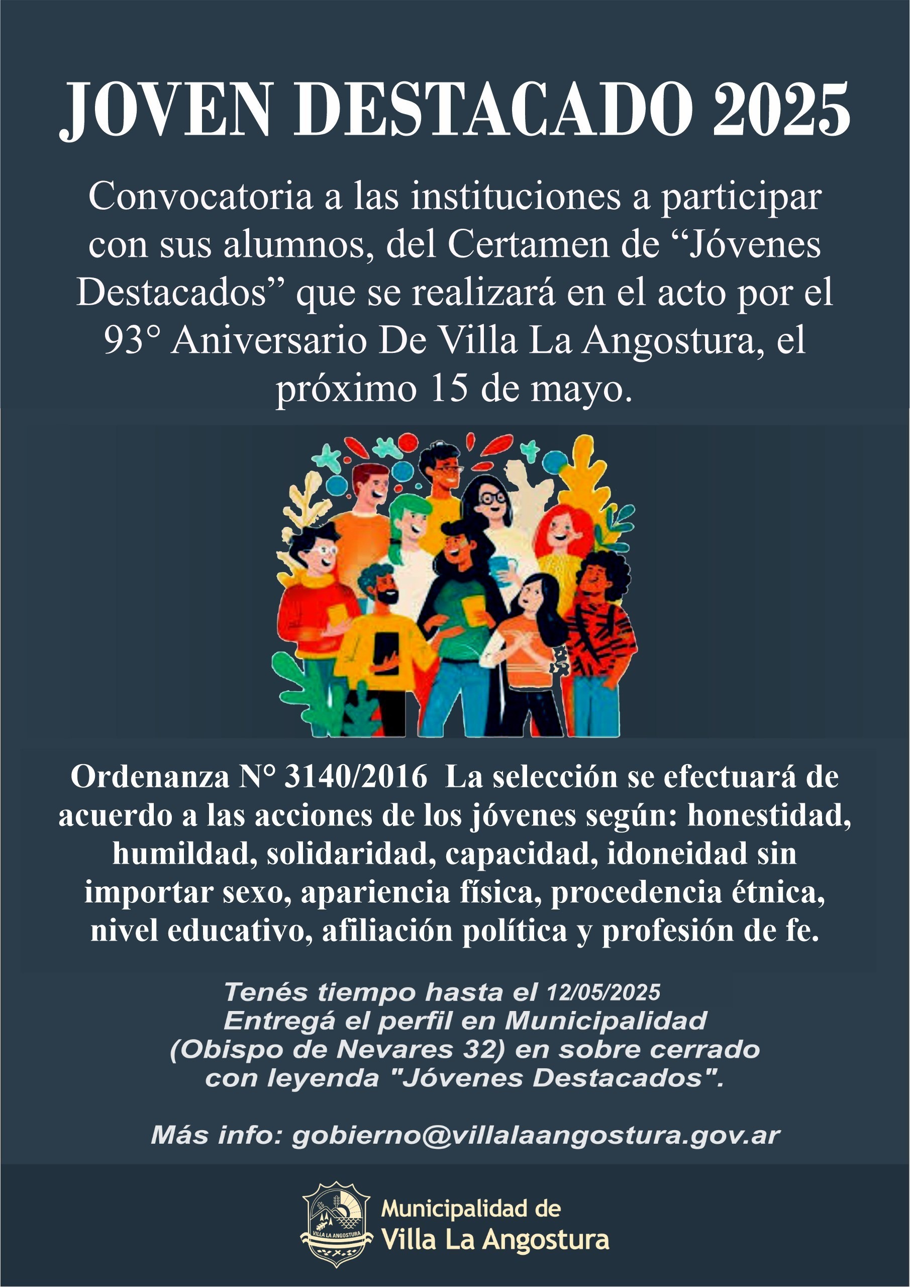 La Municipalidad de Villa La Angostura anunció la extensión del plazo de convocatoria para el Certamen de “Jóvenes Destacados”, una iniciativa que busca visibilizar y reconocer a jóvenes de entre 16 y 25 años que se destacan por sus valores y acciones en la comunidad.