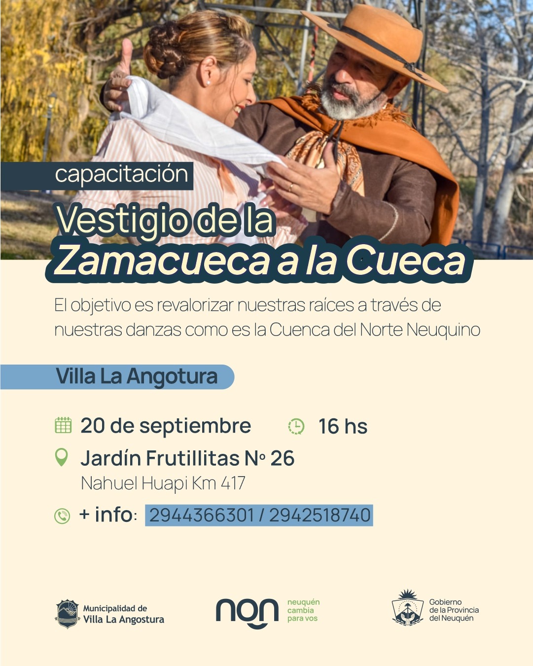La Municipalidad de Villa La Angostura invitó a la comunidad a participar de la capacitación “Vestigio de la Zamacueca a la Cueca”, una propuesta cultural que busca revalorizar las raíces a través de las danzas tradicionales de la Cuenca del Norte Neuquino.